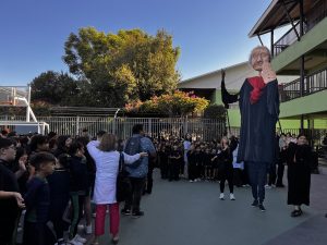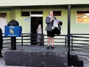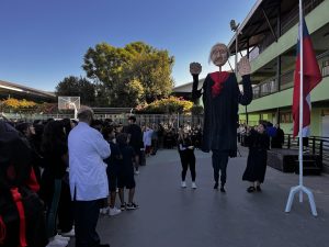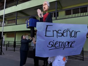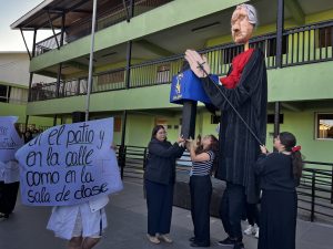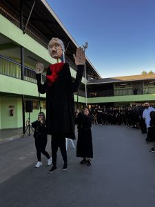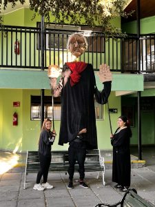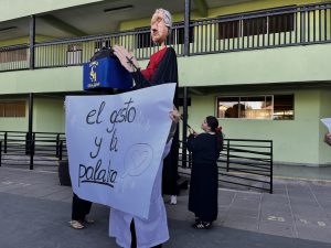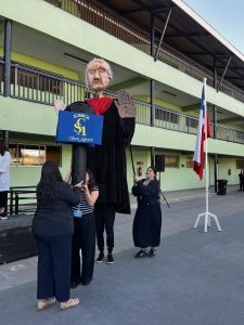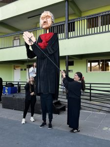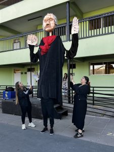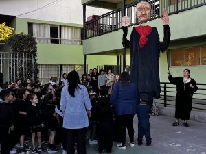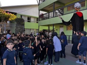 También tuvimos la oportunidad de ver la representación de nuestra Nobel de Literatura como una gran marioneta, encantando a los/las estudiantes, quienes muy atentos escucharon su intervención, en la que contó sobre su vida y sus convicciones, pues creía firmemente que la educación era el camino para transformar la sociedad.